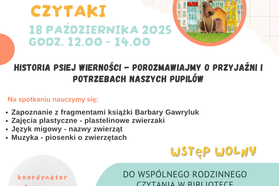 Już 18 października 2025 r. (sobota) w godz. 12:00–14:00 spotkamy się w Miejskiej Bibliotece im. A. K. Cebrowskiego w Łowiczu, aby wspólnie porozmawiać o przyjaźni… Dowiedz się więcej »Klub Czytających Rodzin „Dzieciaki Czytaki” zaprasza!