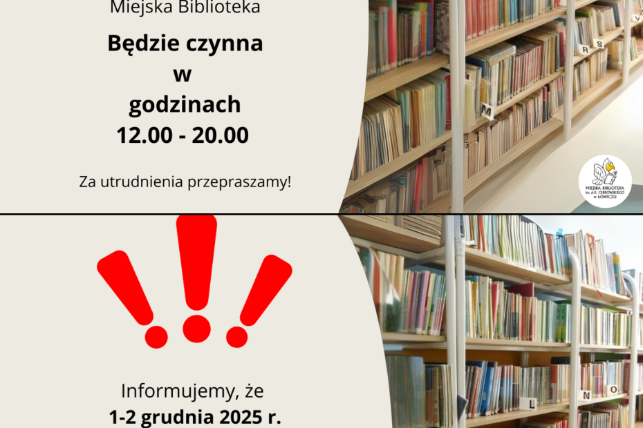 Informujemy, że 𝟐𝟖 𝐥𝐢𝐬𝐭𝐨𝐩𝐚𝐝𝐚 𝟐𝟎𝟐𝟓 𝐫.(piątek) Biblioteka będzie czynna w godzinach 𝟏𝟐:𝟎𝟎–𝟐𝟎:𝟎𝟎. Zmiana godzin otwarcia wynika z organizacji Nocy Bibliotek z Cebrowskim. Natomiast w dniach… Dowiedz się więcej »Uwaga Czytelnicy!
