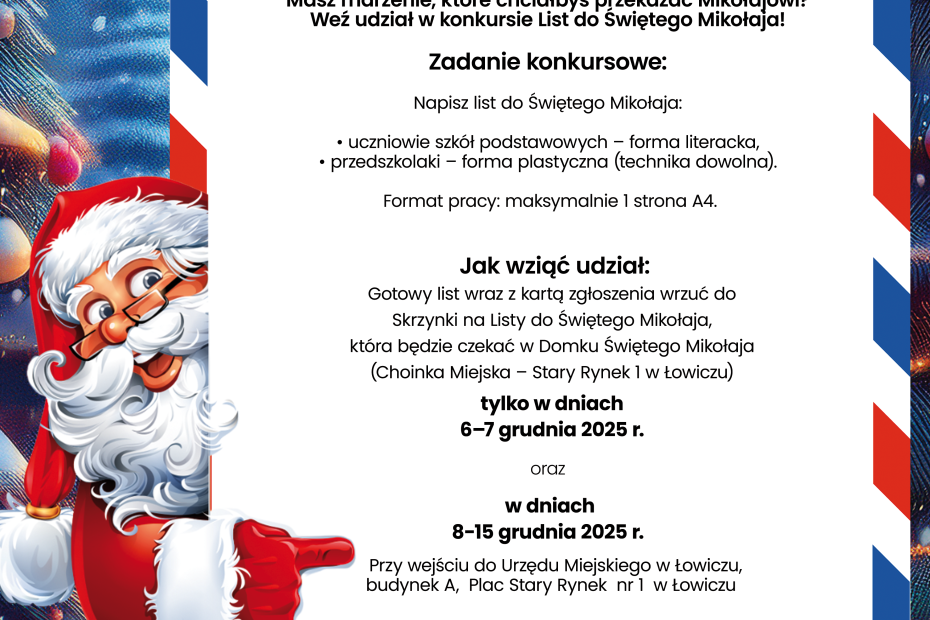 Konkurs pn. LIST DO ŚWIĘTEGO MIKOŁAJA pod Honorowym Patronatem Burmistrza Miasta Łowicz (edycja 2025)przez Hubert KrajewskiData publikacji: 05-12-202505-12-2025
