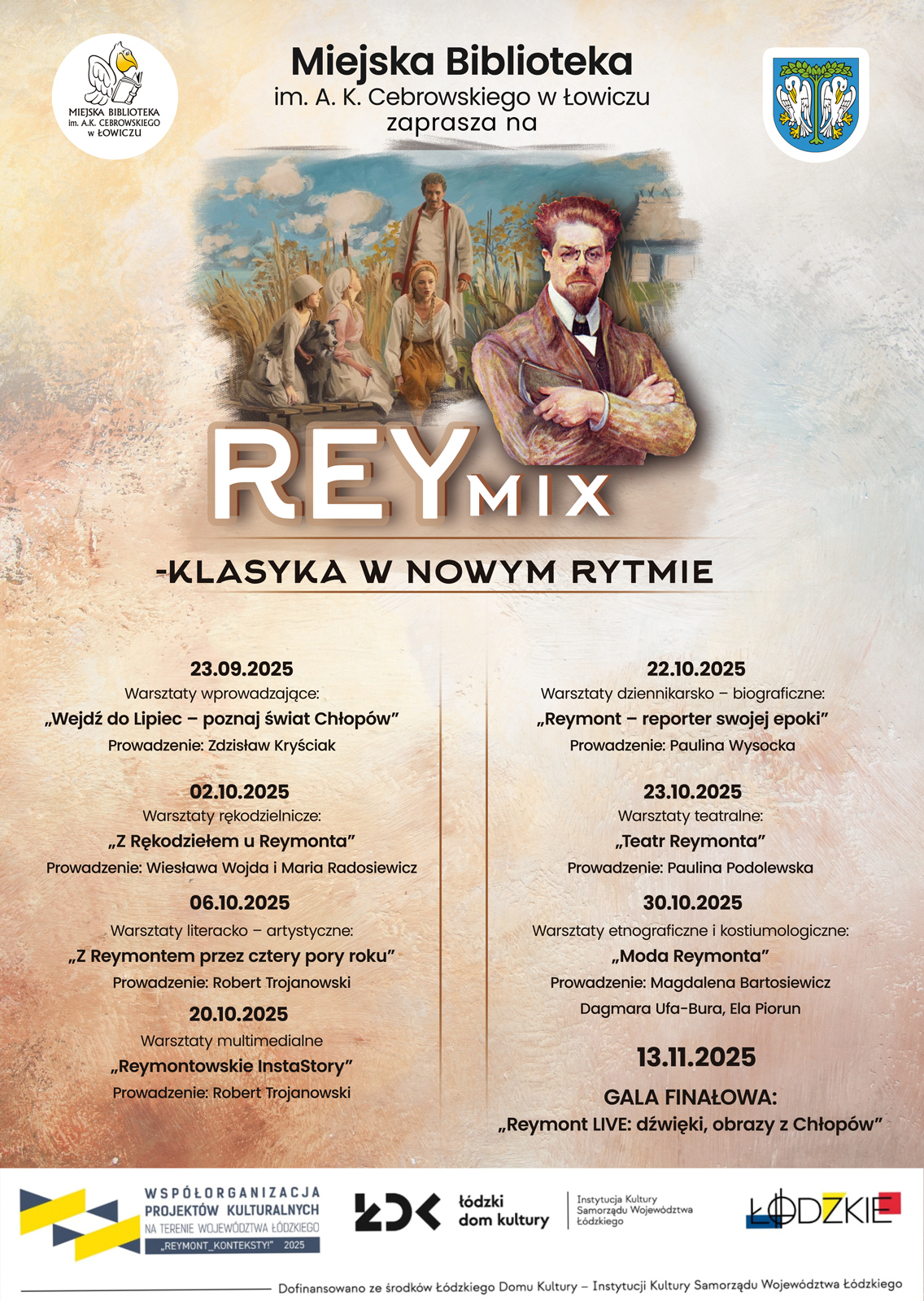 Miejska Biblioteka im. A. K. Cebrowskiego w Łowiczu jest beneficjentem projektu pn. „REYmix – klasyka w nowym rytmie” realizowanym w ramach naboru na współorganizację projektów kulturalnych związanych z obchodami Roku Władysława Stanisława Reymonta – „REYMONT_KONTEKSTY!” 2025 organizowanym przez Łódzki Dom Kultury samorządową instytucję kultury Województwa Łódzkiego.