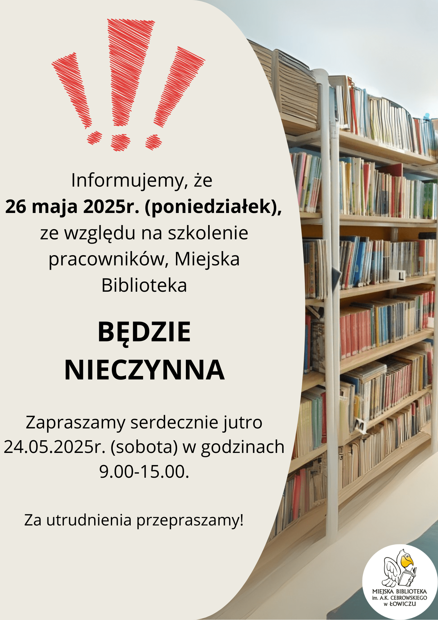 26 maja 2025r. (poniedziałek) biblioteka będzie nieczynna ze względu na szkolenie pracowników.