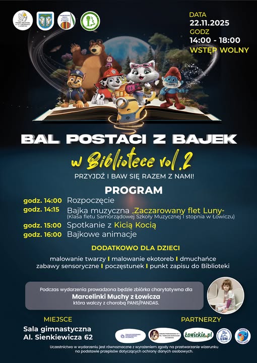 Miejska Biblioteka im. A. K. Cebrowskiego w Łowiczu serdecznie zaprasza na BAL POSTACI Z BAJEK w Bibliotece vol. 2! Już 22 listopada 2025 r. (sobota) w godzinach 14:00–18:00 spotykamy się