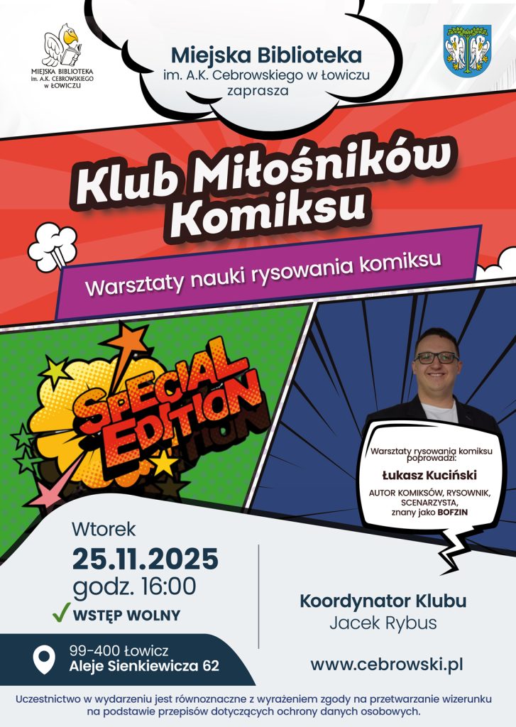 We wtorek, 25 listopada, w Miejskiej Bibliotece im. A. K. Cebrowskiego w Łowiczu odbyło się spotkanie Klubu Miłośników Komiksu. Koordynator wydarzenia, Jacek Rybus, zachęcił uczestników do sięgania po komiksy oraz
