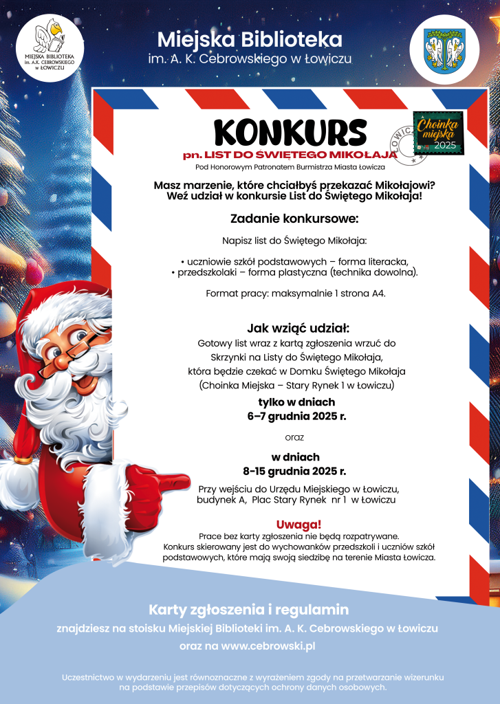 Pierwsze prezenty od Świętego Mikołaja trafiły już wczoraj do kilku dzieci z naszego miasta, które wzięły udział w konkursie na list do Świętego Mikołaja. Naszemu Świętemu Mikołajowi pomógł Burmistrz Miasta Łowicza Mariusz Siewiera oraz Dyrektor Miejska Biblioteka im A K Cebrowskiego w Łowiczu, która to zorganizowała konkurs. Gratulujemy naszym zdolnym