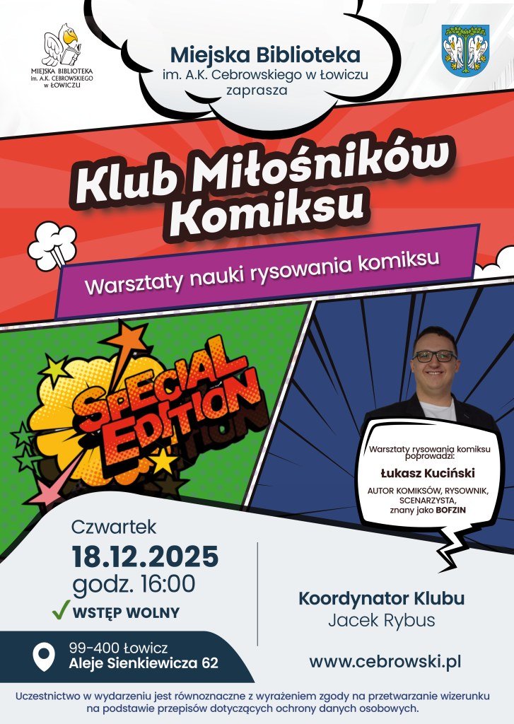 Już 18 grudnia 2025 (czwartek) o godz. 16:00 odbędzie się kolejne spotkanie Klubu Miłośników Komiksu połączona z warsztatami nauki rysowania komiksu! Marzysz o stworzeniu własnego komiksu? Chcesz nauczyć się rysować bardziej dynamicznie, ciekawie i w stylu, który przyciąga wzrok? A może po prostu kochasz komiksy i chcesz spędzić kreatywne popołudnie