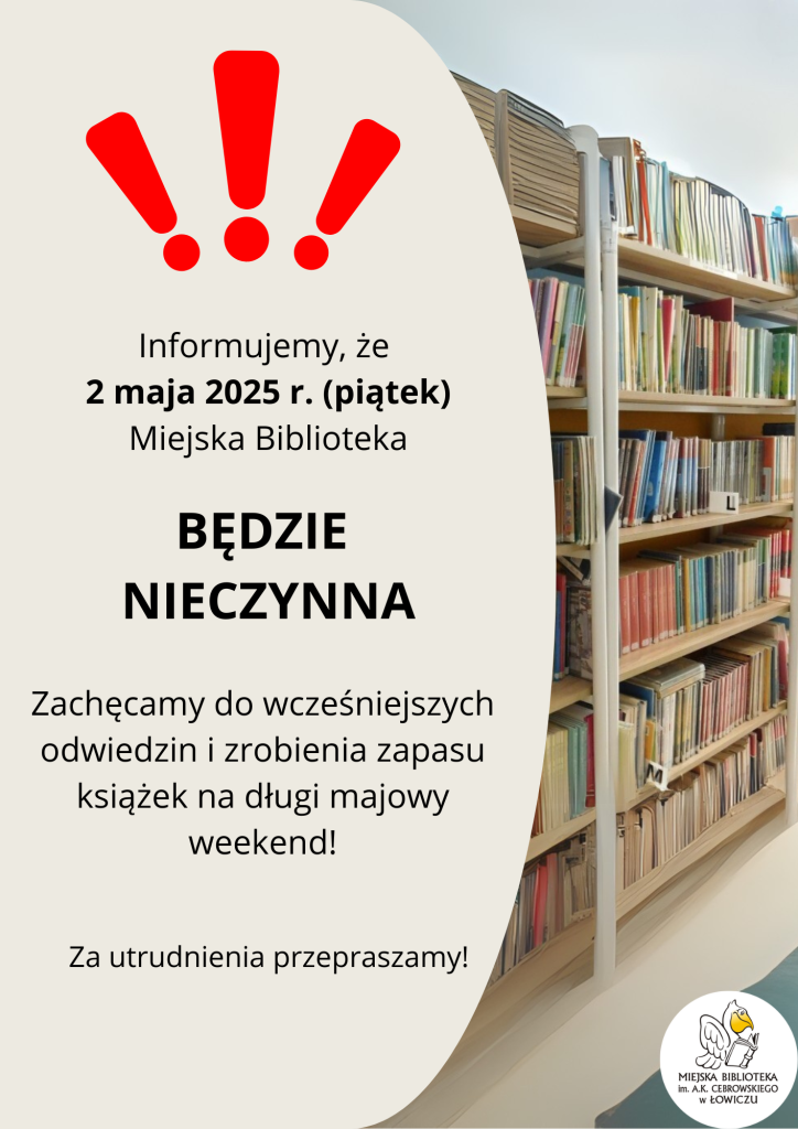 Drodzy czytelnicy! Informujemy, że 31 grudnia 2025r. (środa) Miejska Biblioteka będzie czynna w godzinach 8.00 – 14.00. Za utrudnienia przepraszamy.