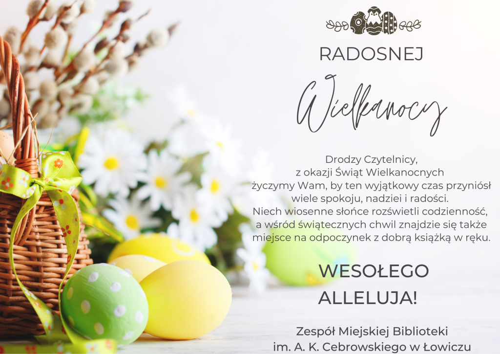 Zdrowych, radosnych i spokojnych Świąt Wielkanocnych oraz serdecznych spotkań w gronie najbliższych osób, Wesołego Alleluja!