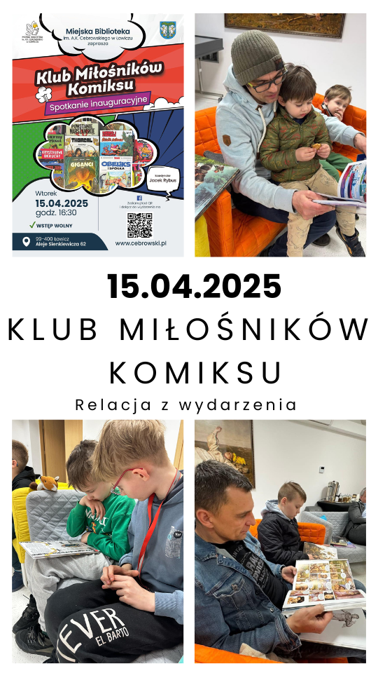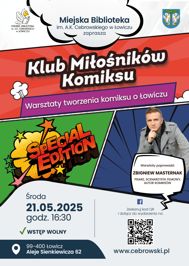 Zapraszamy na wyjątkowe warsztaty komiksowe! Miejska Biblioteka im. A.K. Cebrowskiego w Łowiczu zaprasza wszystkich miłośników komiksów na specjalną edycję Klubu Miłośników Komiksu! Temat warsztatów: Tworzenie komiksu o ŁowiczuWarsztaty poprowadzi: Zbigniew