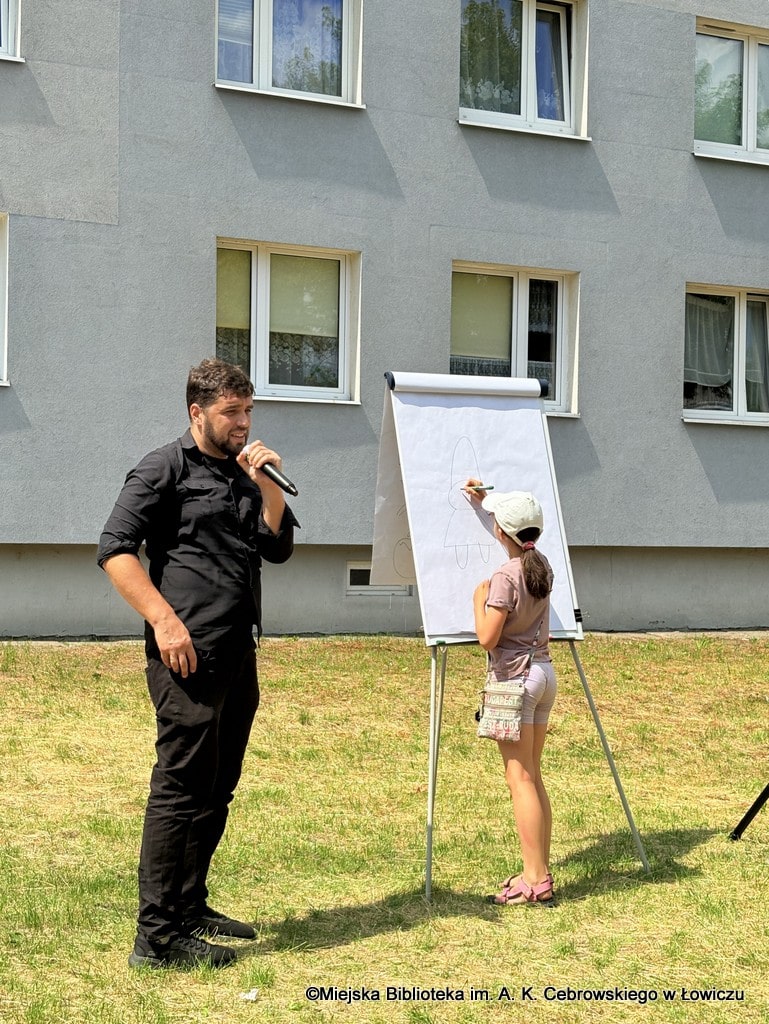 Nasz prowadzący swoją energią zarażał dzieci i z wielkim zaangażowaniem zachęcał je do aktywnego udziału w zajęciach, tworząc atmosferę twórczej zabawy i współpracy.
