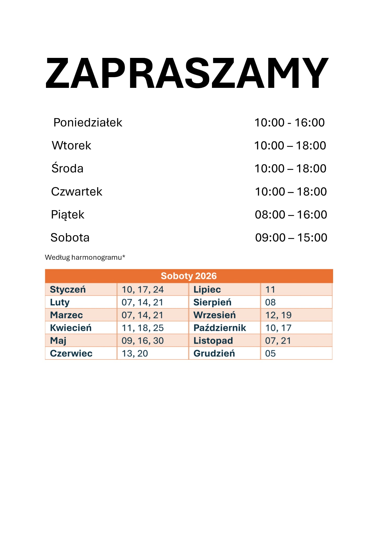 Godziny otwarcia i soboty pracujące w roku 2026