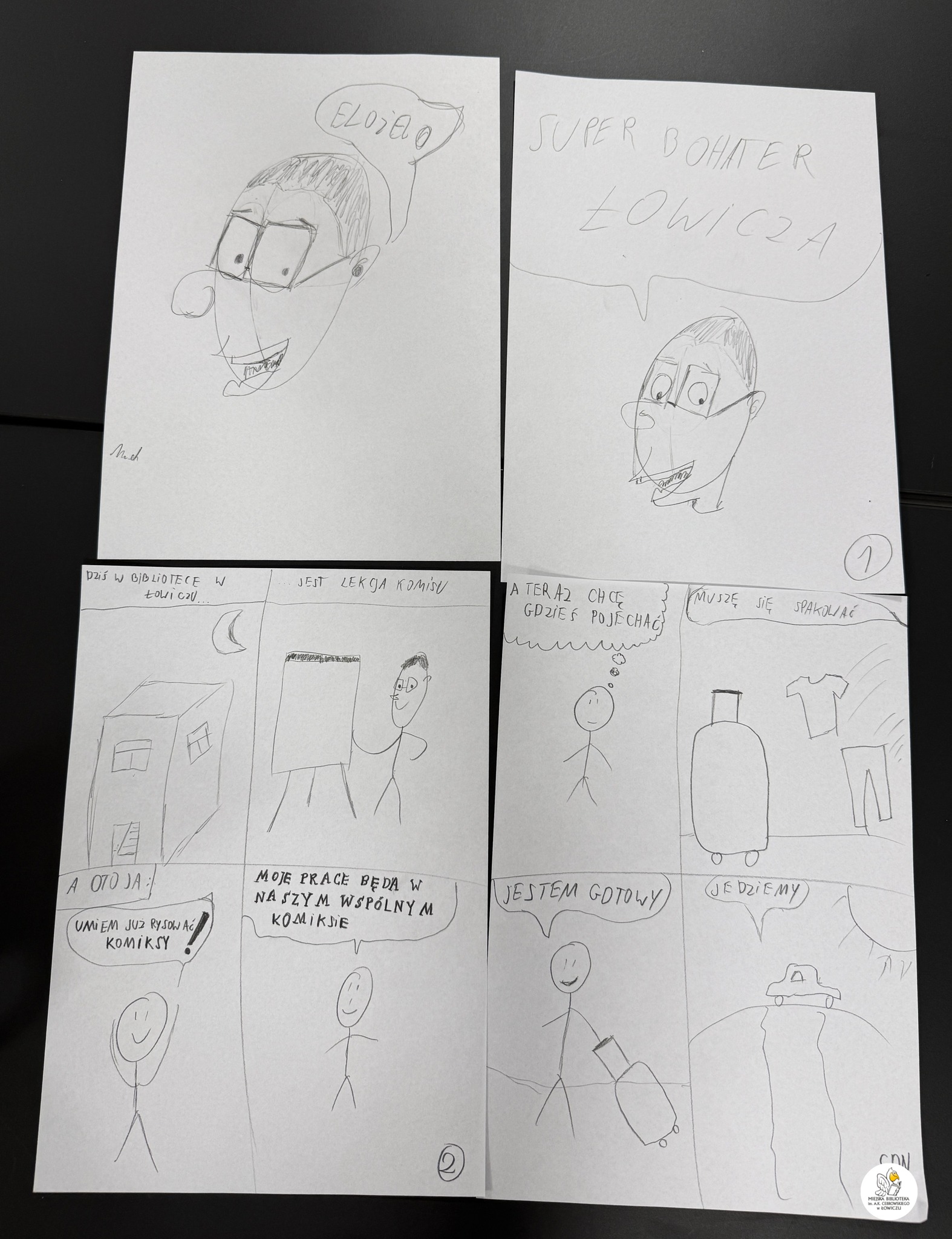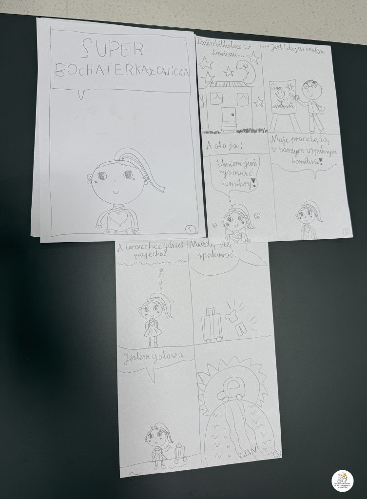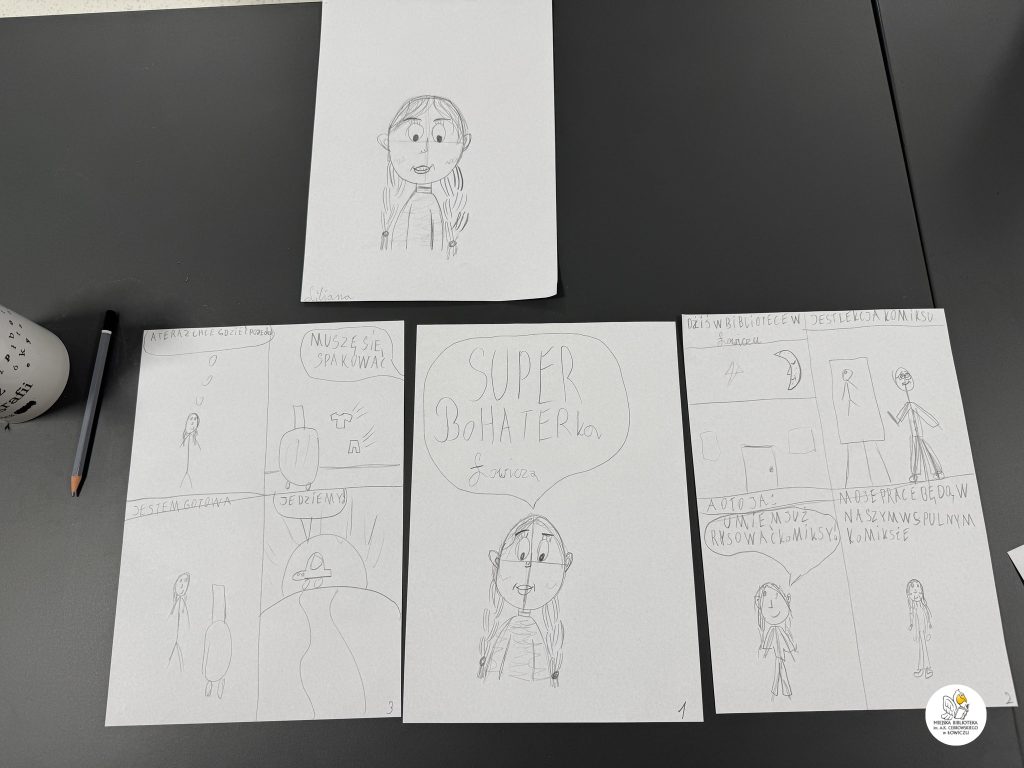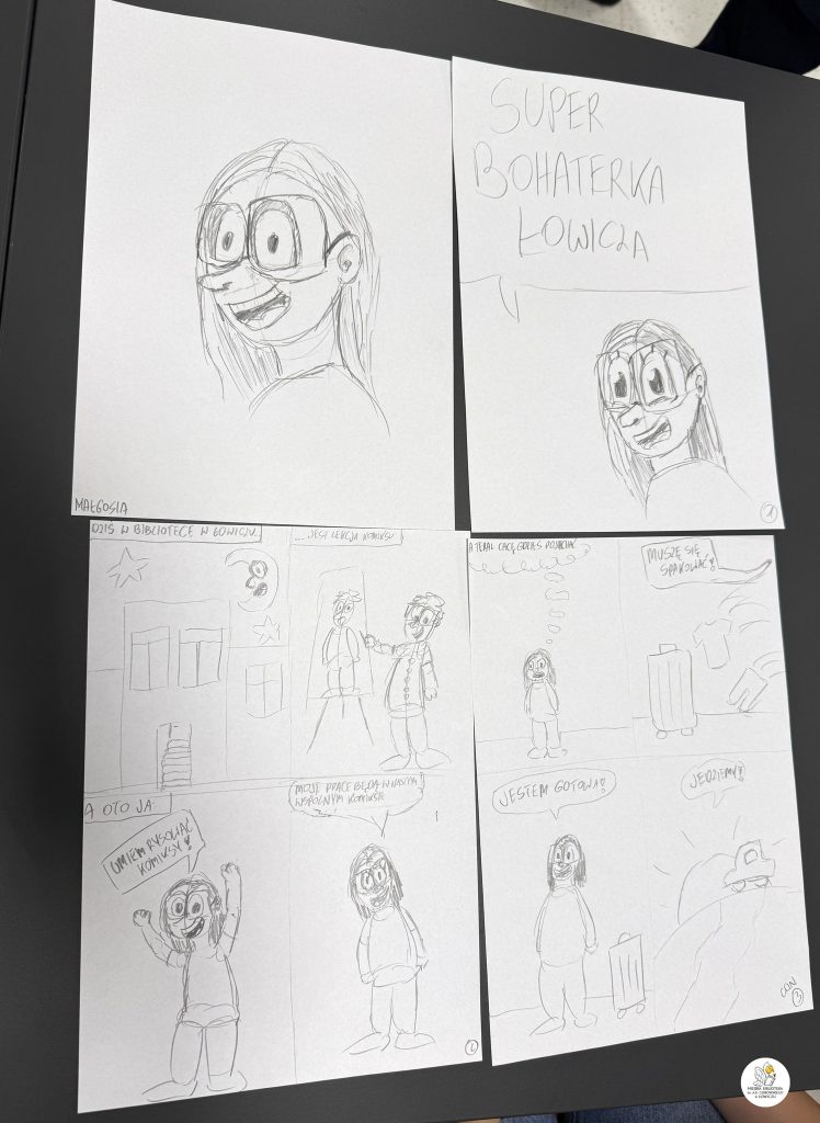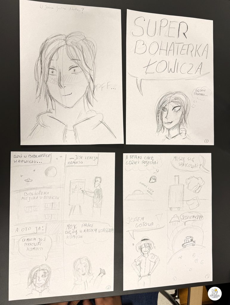 Wspólnie stworzyliśmy także kilkustronicowy komiks, którego głównym bohaterem – co wyjątkowo ciekawe – była każda z osób rysujących. Akcja komiksu rozgrywała się częściowo w naszej Bibliotece, a częściowo w samym Łowiczu.