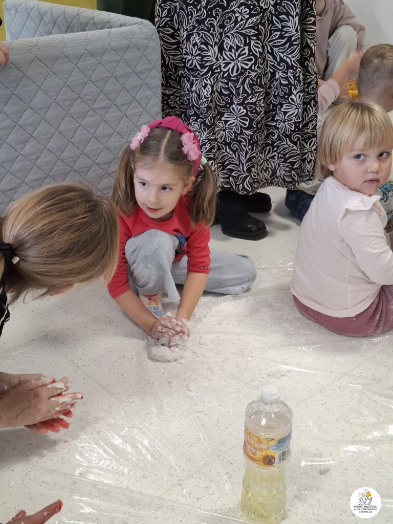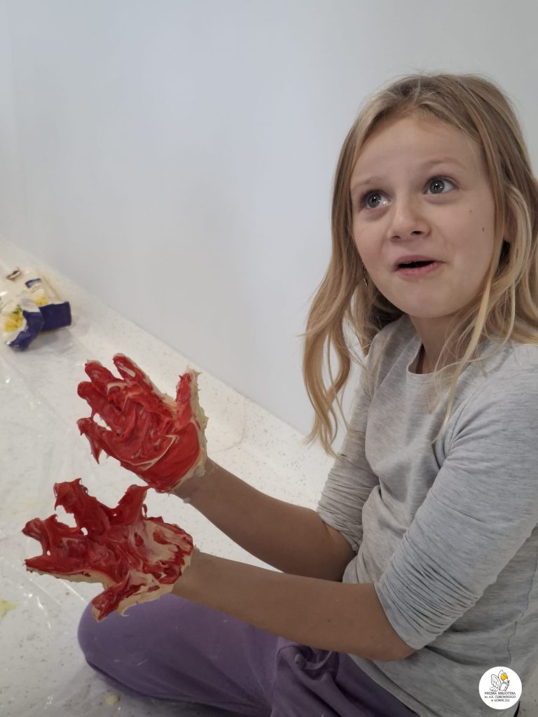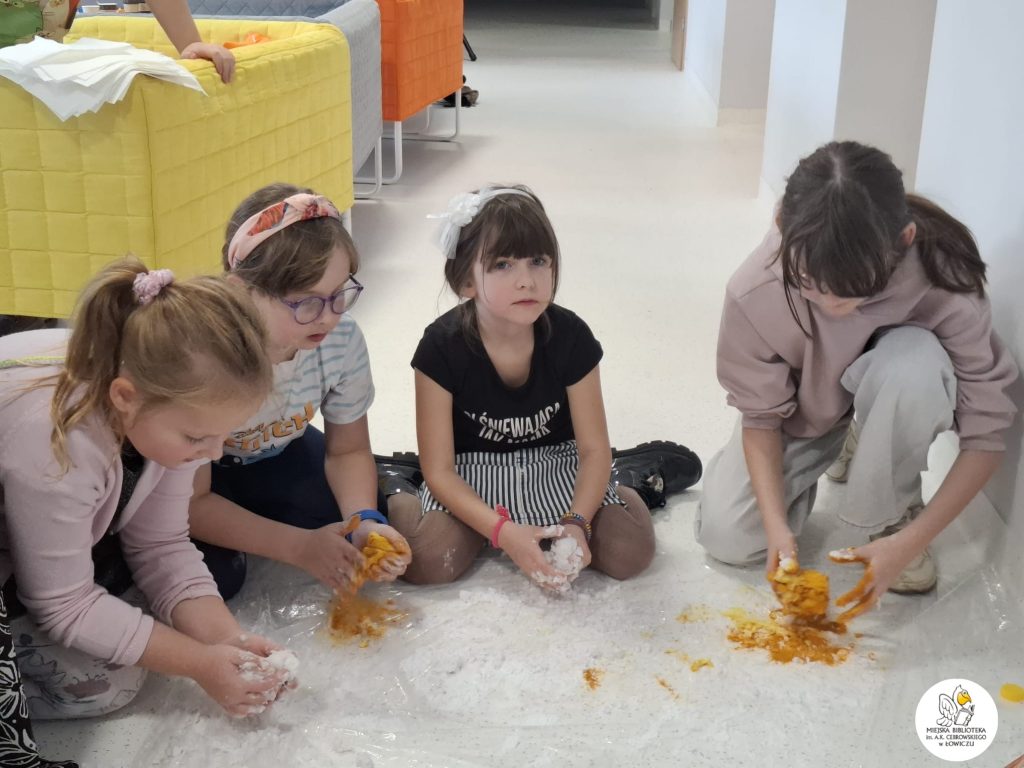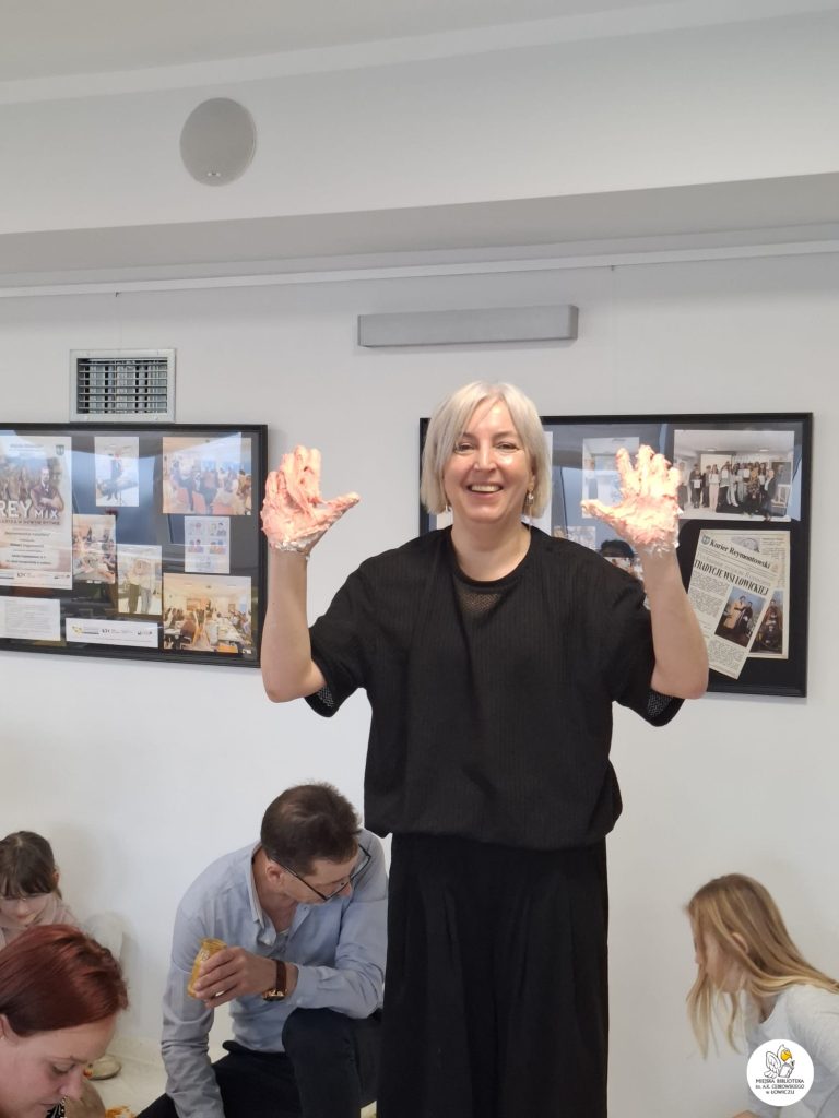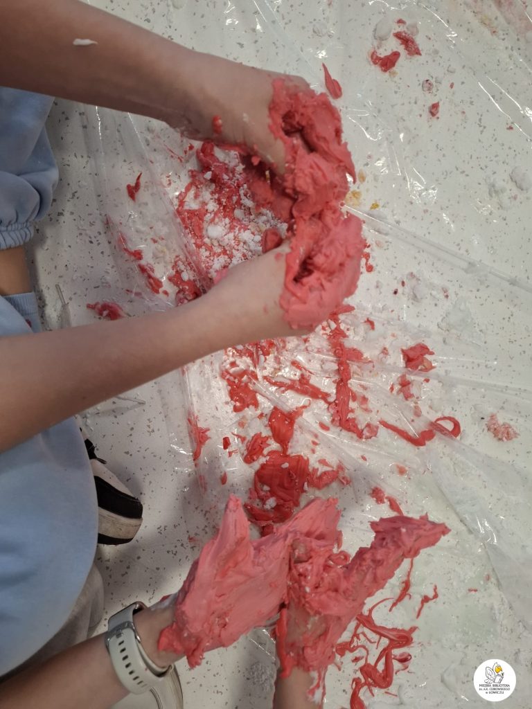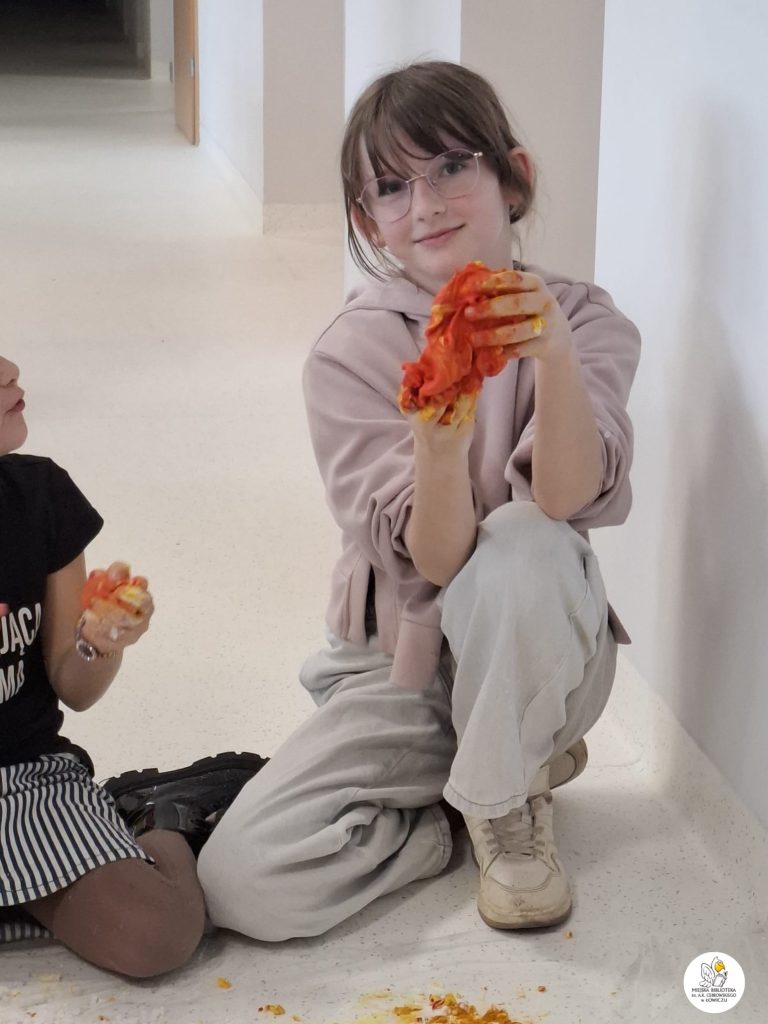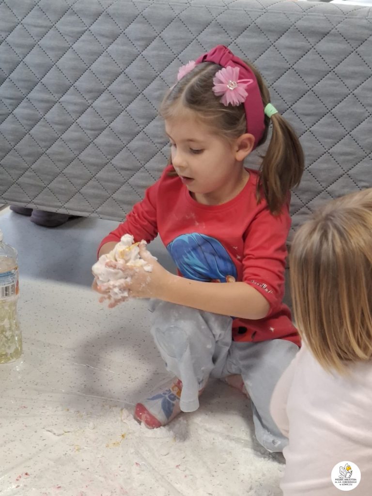 Następnie zabraliśmy się za tworzenie własnego slima z mąki ziemniaczanej, szamponu i barwników spożywczych. Było sporo śmiechu i jeszcze więcej bałaganu — ale właśnie w tym tkwiła cała frajda. Powstały kolorowe, miękkie slimy, które każdy z uczestników mógł zabrać do domu.