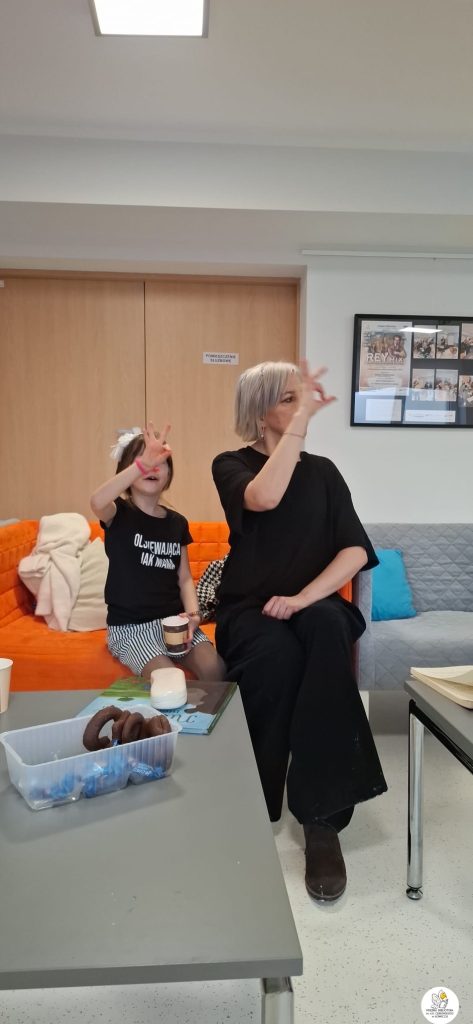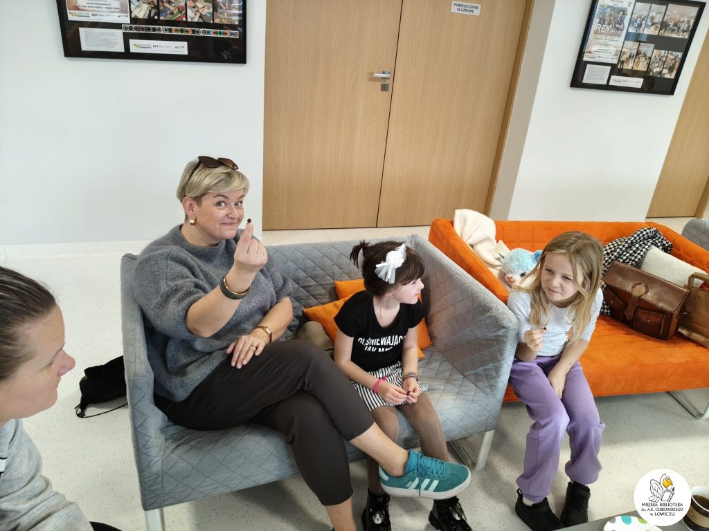Kolejną omawianą książką była „Niebieska niedźwiedzica” Joanny M. Chmielewskiej — piękna i mądra opowieść ucząca akceptacji odmienności. Naszemu Klubowi te wartości są szczególnie bliskie. Jesteśmy otwarci na każdą osobę, a wśród naszych uczestników są również dzieci z niepełnosprawnościami. Uczymy się także języka migowego aby móc porozumieć się z osobami głuchymi. Tym razem poznawaliśmy znaki migowe różnych zwierząt, a dodatkowo powtórzyliśmy alfabet i dni tygodnia.
