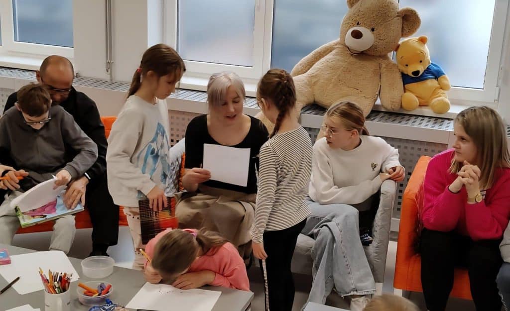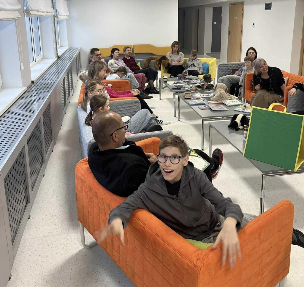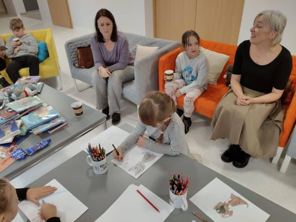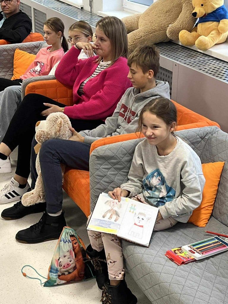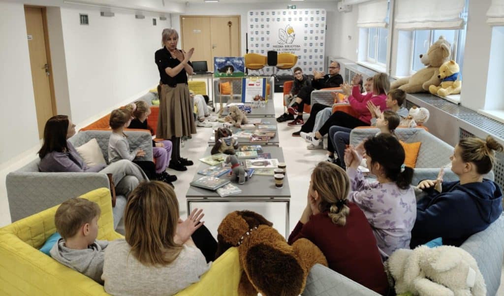 Zanim jednak rozpoczęliśmy wspólne czytanie, odbyła się krótka lekcja Polskiego Języka Migowego (PJM). Pani Klara nauczyła nas, jak migać słowa związane ze zwierzętami – m.in. „weterynarz”, „pies”, „kot” czy „mysz”. Niektóre znaki wywołały mnóstwo śmiechu – zwłaszcza „kura”, którą miga się, stukając palcem w dłoń!